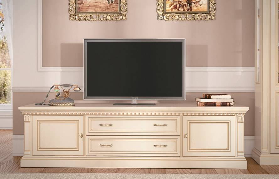 Мебель под телевизор в гостиную делается из совершенно разных материалов, подобрать ее для любого помещения несложно. Для классического стиля подойдет изделие, выполненное из дерева в том же дизайне. Такая мебель выглядит дорого, позволяет создать в помещении теплую и приятную атмосферу уюта.