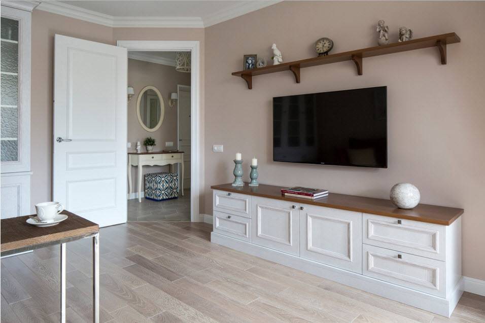 Существуют также компактные, минималистичные варианты, которые подразумевают установку только телевизора и нескольких предметов декора. Они отлично подойдут для маленькой гостиной комнаты, гармонично дополнят интерьер.