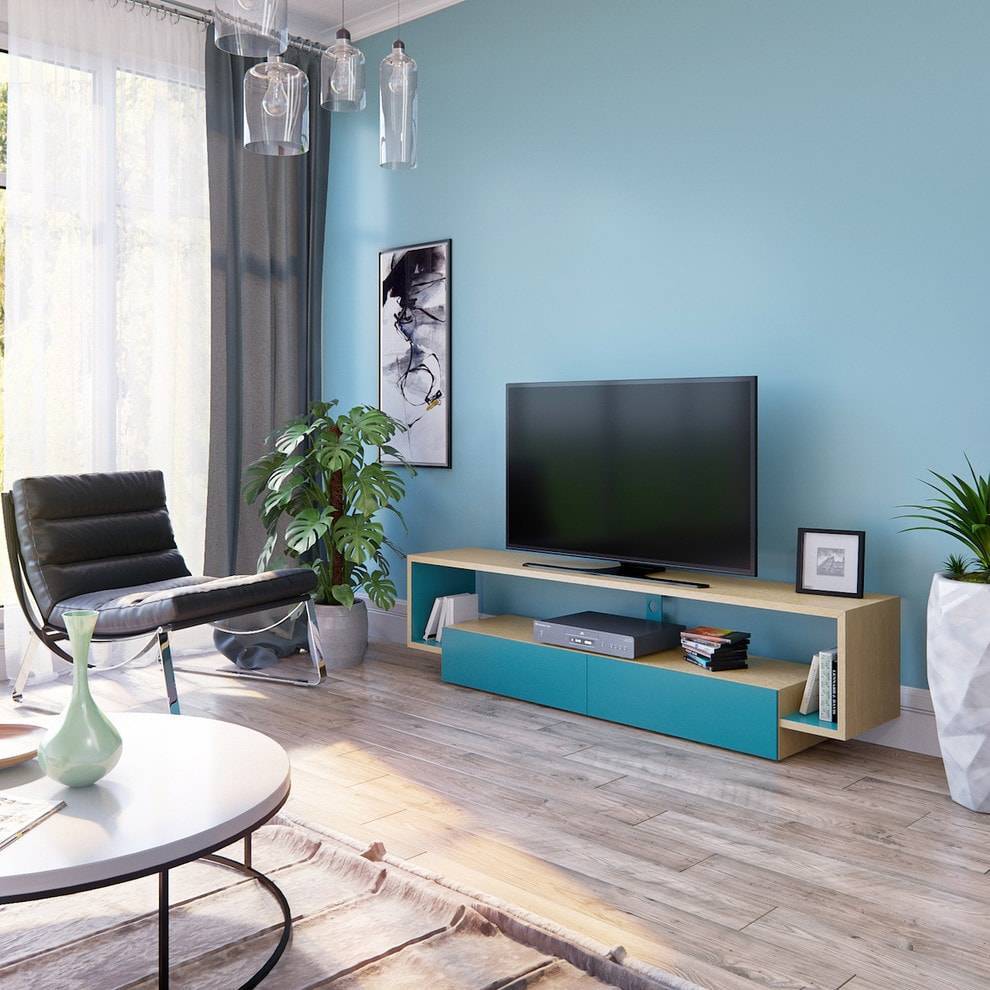 В современных квартирах нередко встречаются подвесные тумбы под телевизор. Они делают помещение чуть более просторным и воздушным. Такая модель крепится непосредственно к стене, а под ней остается свободное пространство.