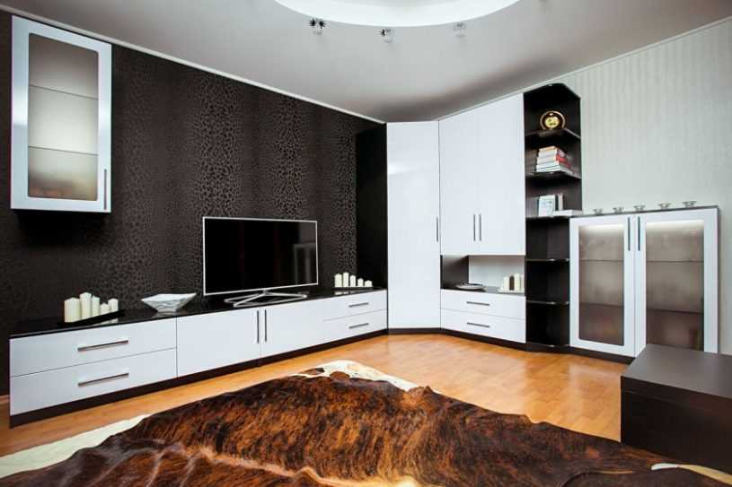 Угловые стенки устанавливаются в больших комнатах. Они занимают много места и трудно поддаются трансформации. Шкаф, закрывающий угол, нельзя двигать или переставлять. Фактически он становится центром композиции, а переставлять отдельные модули можно только вокруг него. Сделать хороший дизайнерский проект угловой стенки не так просто.