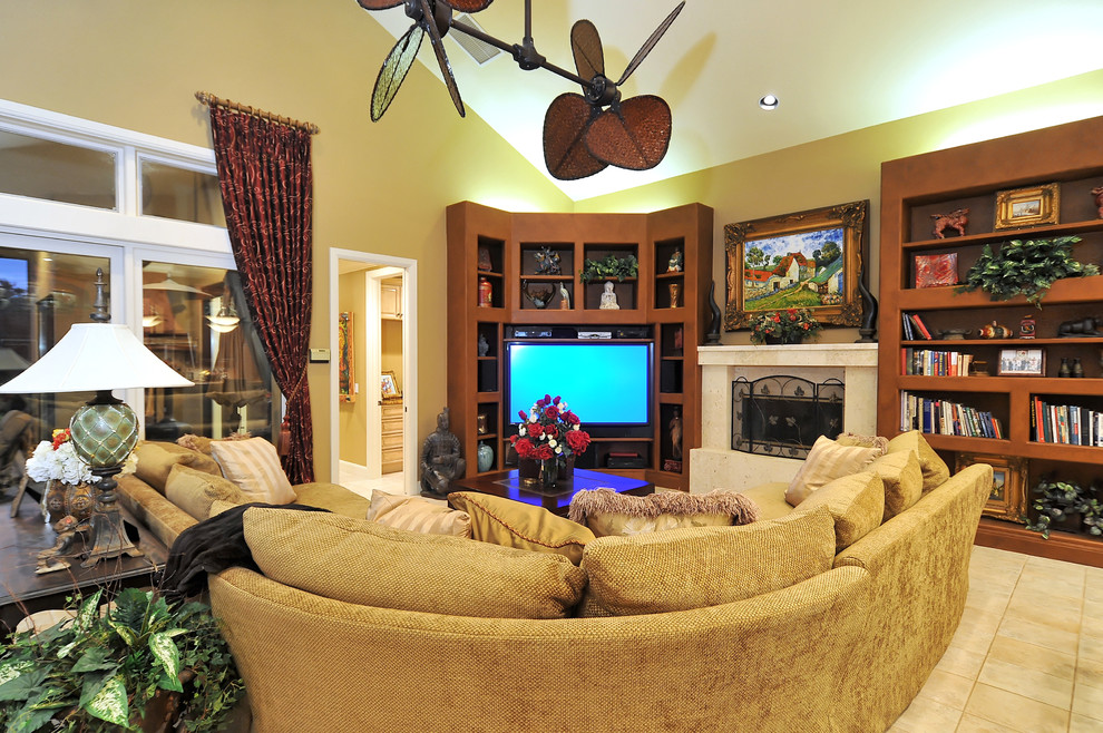 Пример круговой расстановки мебели в гостиной. Здесь обязательно есть центральный элемент – чаще всего это журнальный столик