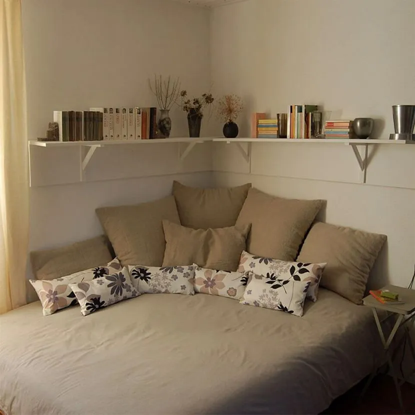 - Коррекция неровностей стены. Благодаря установке мебели в угол можно легко скрыть кривизну примыкания стен, а также некоторые погрешности поклейки обоев.