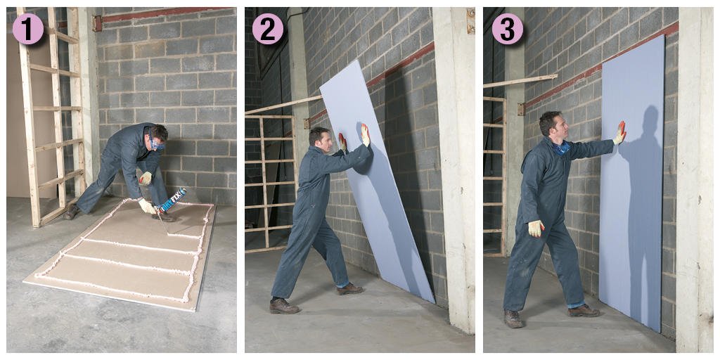 - Приклеивание гипсокартона на поверхность. На обратную сторону ламинированных плит наносят специальный клей. Затем их подносят к базовой поверхности так, чтобы они точно попали на скотч, и плотно их прижимают.
