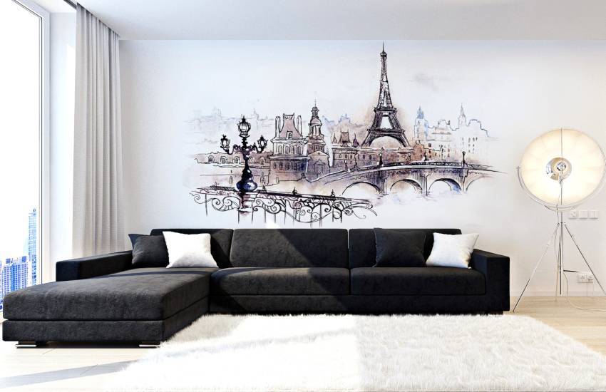 Настенные поверхности не стоит перегружать декором. Для разнообразия можно повесить панно или фото в единственном экземпляре. Как вариант — плазменный телевизор. Для оформления стен используются светлые оттенки.