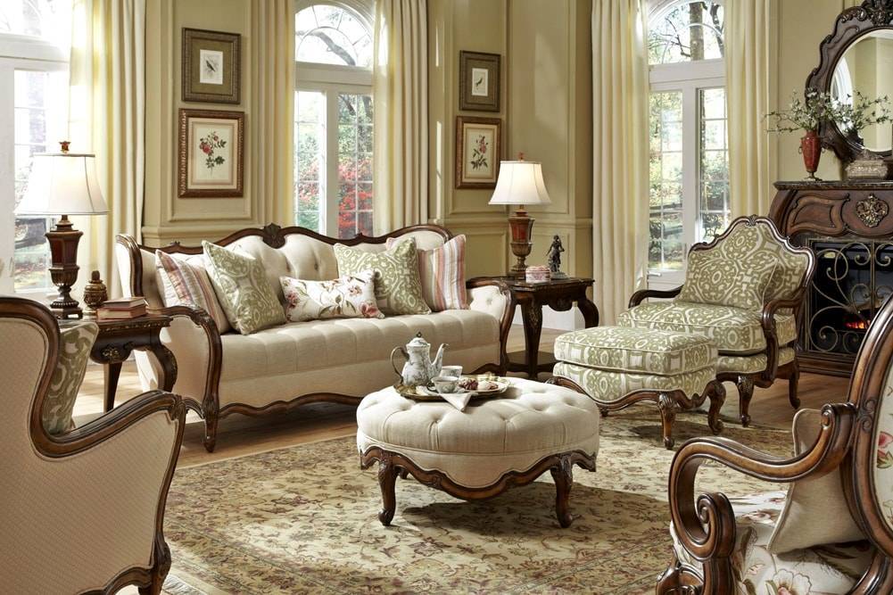 Диваны, кровати, кресла, столы и стулья – объемные и массивные, дополнительно украшены резьбой, мягкая мебель с качественной, толстой обивкой. Актуальными предметами меблировки также являются комоды, сундуки и напольные часы.
