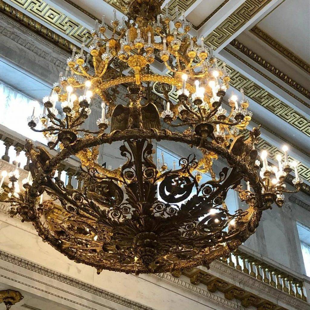Обратите внимание на люстры в викторианском стиле и металлические бра