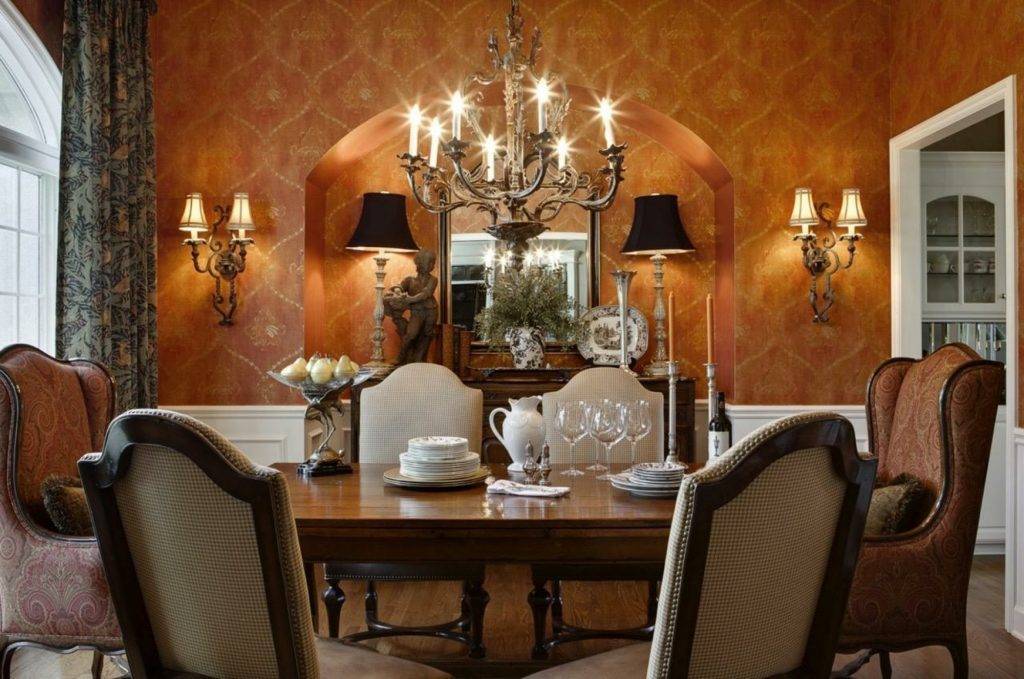 Семейные реликвии, старинные вещи, статуэтки, сувениры и экзотические аксессуары будут смотреться весьма уместно в этом стиле. Статусность подчеркнут кованые светильники, антиквариат, зеркала и картины в роскошных рамах.