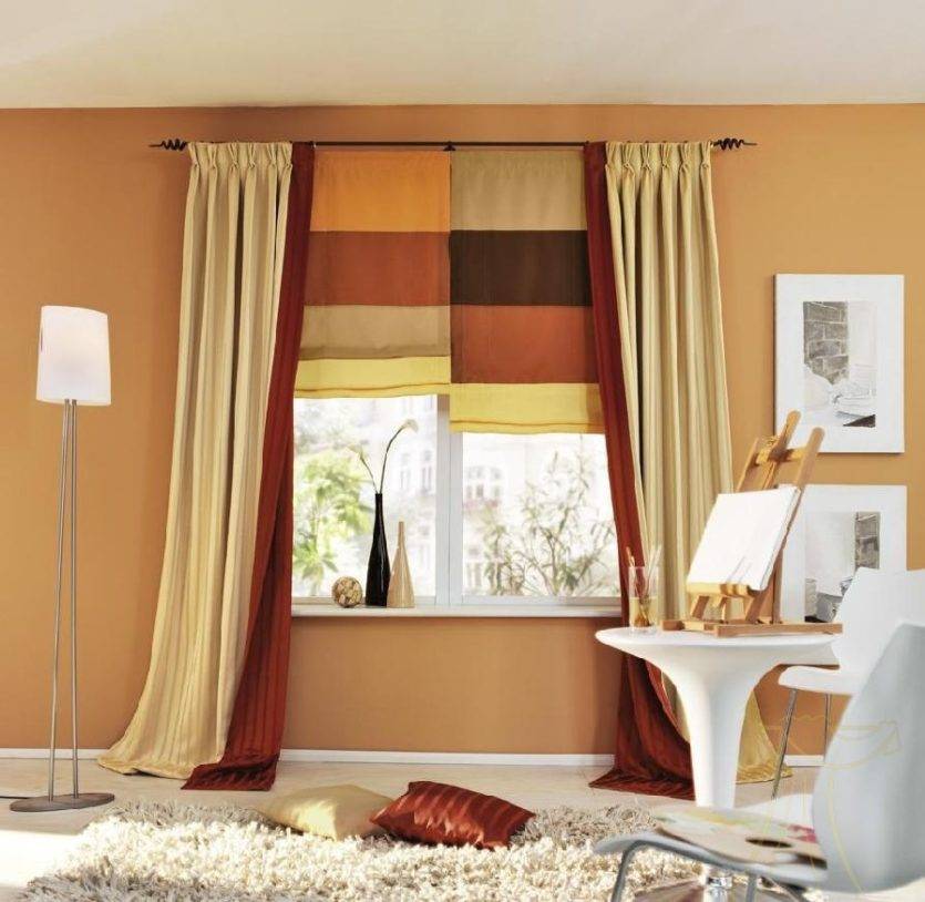 Самый востребованный вариант – полупрозрачная тонкая занавеска и две портьеры, разные по плотности и даже цвету, обязательны драпировки.