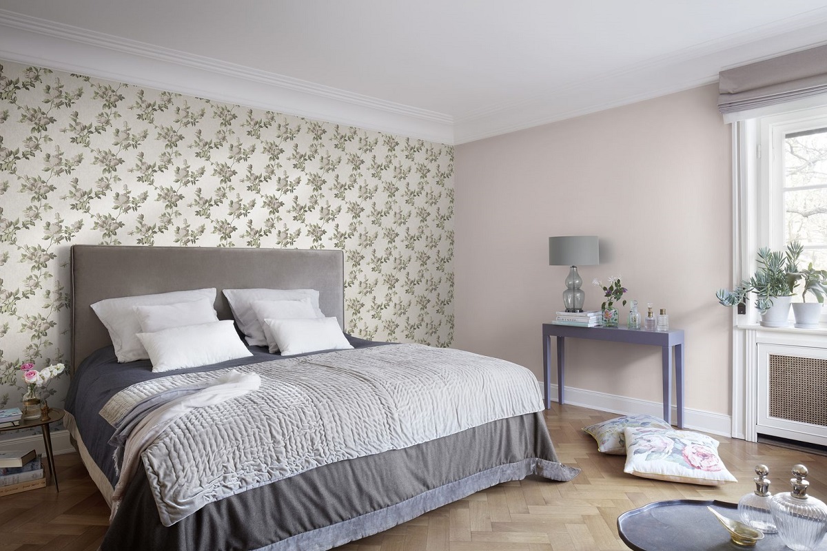 В качестве настенного покрытия для спальни лучше выбрать оттенок в более приглушенных тонах.