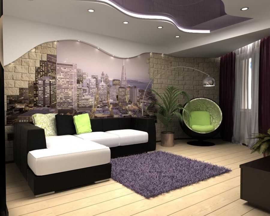 В этом случае на помощь придет такой дизайнерский прием, как зонирование. Можно выделить зону отдыха, отметив её ярким принтом на фоне однотонных стен в той же цветовой гамме. Можно так же отметить затейливой фактурой ниши и колоны, имеющиеся в комнате.