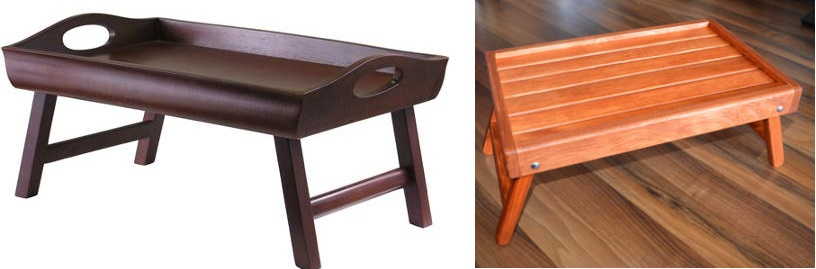 Столики без бортов так же удобны, но, пользуясь ими, нужно быть осторожным, чтобы не перевернуть чашку, тарелку или стакан. Такие конструкции можно использовать не только для подачи завтрака в постель, на них можно устанавливать ноутбук, планшет или электронную книгу. Это простые накроватные столики, которые можно сделать самостоятельно практически из любых материалов.
