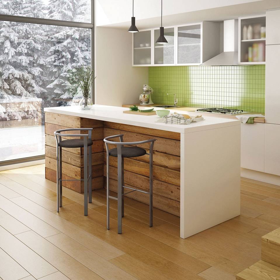 Ещё один вариант минимизации обеденного пространства — выносная обеденная (барная) стойка с узкими высокими стульями. Малую ширину стойки компенсируют параллельные полки над ней.