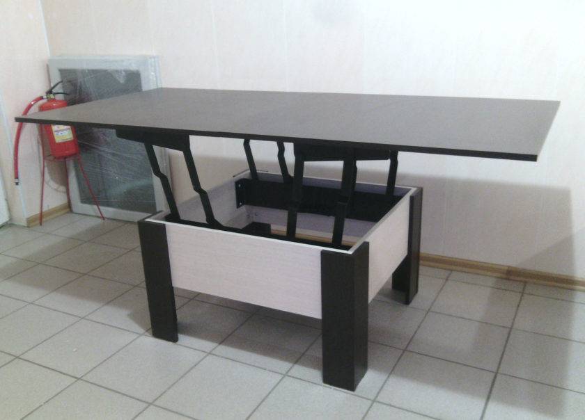 Стол имеет возможность трансформировать столешницу с помощью подъёмного механизма.