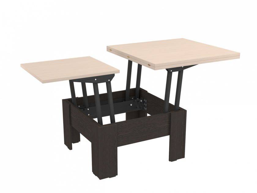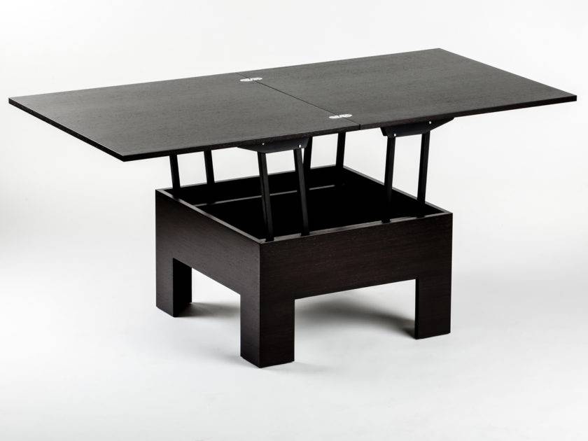 В обычном положении изделие выглядит как обычный журнальный стол-трансформер, который может располагаться в зоне мягкой мебели или разделять функциональные зоны в помещении. Механизм трансформации позволяет получить полноценный обеденный стол в считанные минуты.