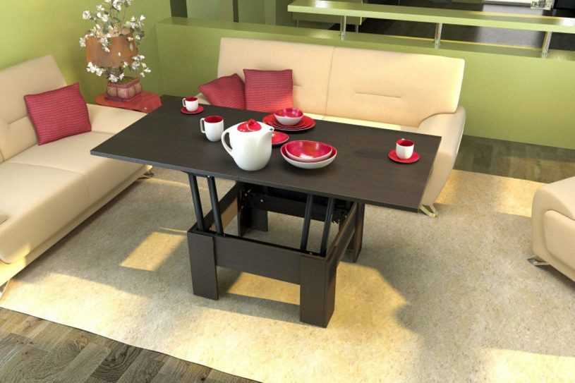 Журнально-обеденный стол подходит для любого интерьера гостиной и позволяет делать из небольшого и невысокого столика большой обеденный стол.