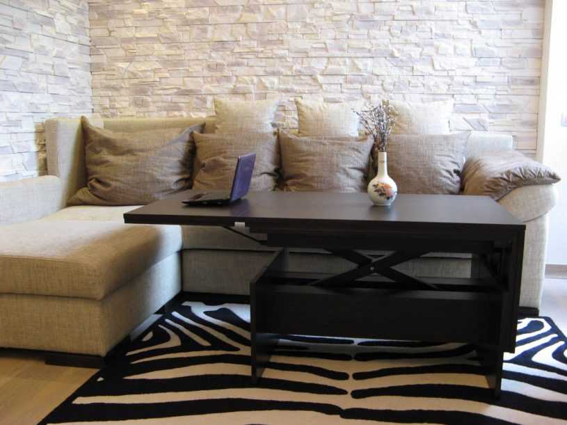 Очень удобен вариант, когда столешница просто поднимается вверх и выдвигается вперед, оставляя под собой ящик для бумаг и всяких мелочей. Такой вариант кофейного-журнального столика подойдет любителям поработать с ноутбуком, расположившись на диване.