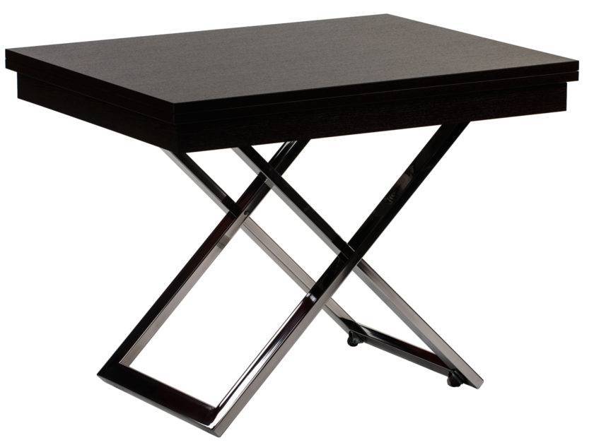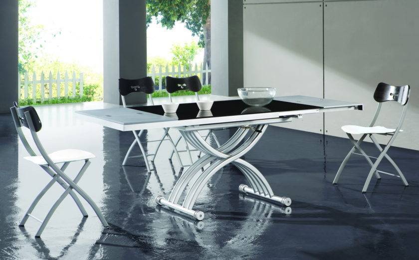 - Gomlden2109-3. Несмотря на то, что производитель этого стола типовой представитель из Китая, данная модель ни в чем не уступает по функциональности и качеству именитым итальянским моделям. Механизм раскрытия выполнен по типу «бабочка». Корпус – металлический, столешница – каленое стекло. Предусмотрена регулировка по высоте. Отлично подойдет в любую современную квартиру. Формат – журнальный столик. Габариты в сложенном состоянии: 120х74 см.