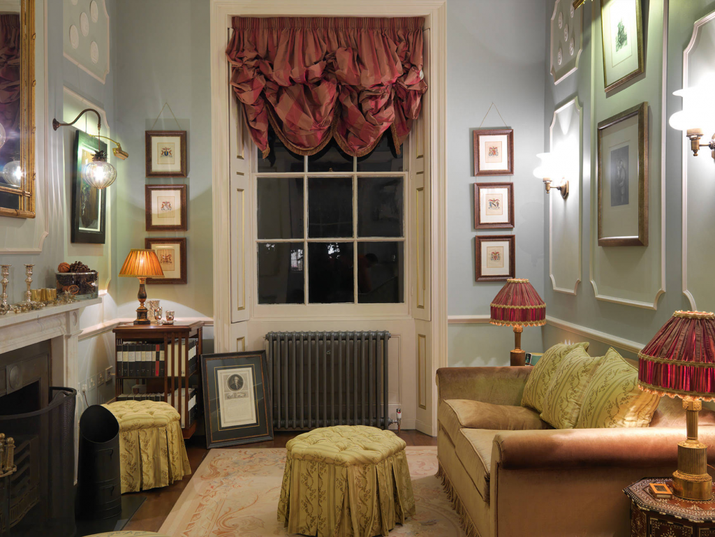 Эркер в гостиной. Место для экспериментов и практичной фантазии, но не стоит забывать. Например, эркер можно надежно изолировать от всего помещения тяжелой гобеленовой портьерой или просто обозначить его границу шторами-нитями. Для эркера как части классической гостиной подойдут австрийские шторы, с тяжеловесными складками, добавляющие помещению богатства, парадности и роскоши. Ими декорируют окна, которые не планируют в дальнейшем открывать. Или когда вид за окном желает быть много лучше (унылый район современной застройки, слишком близко стоящий соседний дом или оживленный проспект) – такими шторами можно будет красиво закрыть эркерные окна.