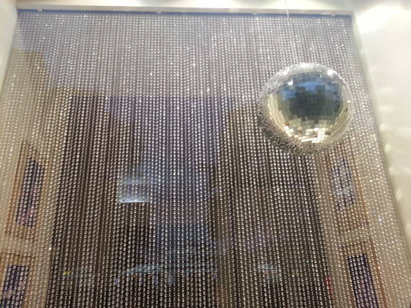 Если в комнате для гигиены достаточно много никелированной сантехники, то нитяной декор должен соответствовать обстановке. В нее хорошо впишутся полосы с блестящим монистом. Или можно подобрать плоские ромбы из нержавейки.