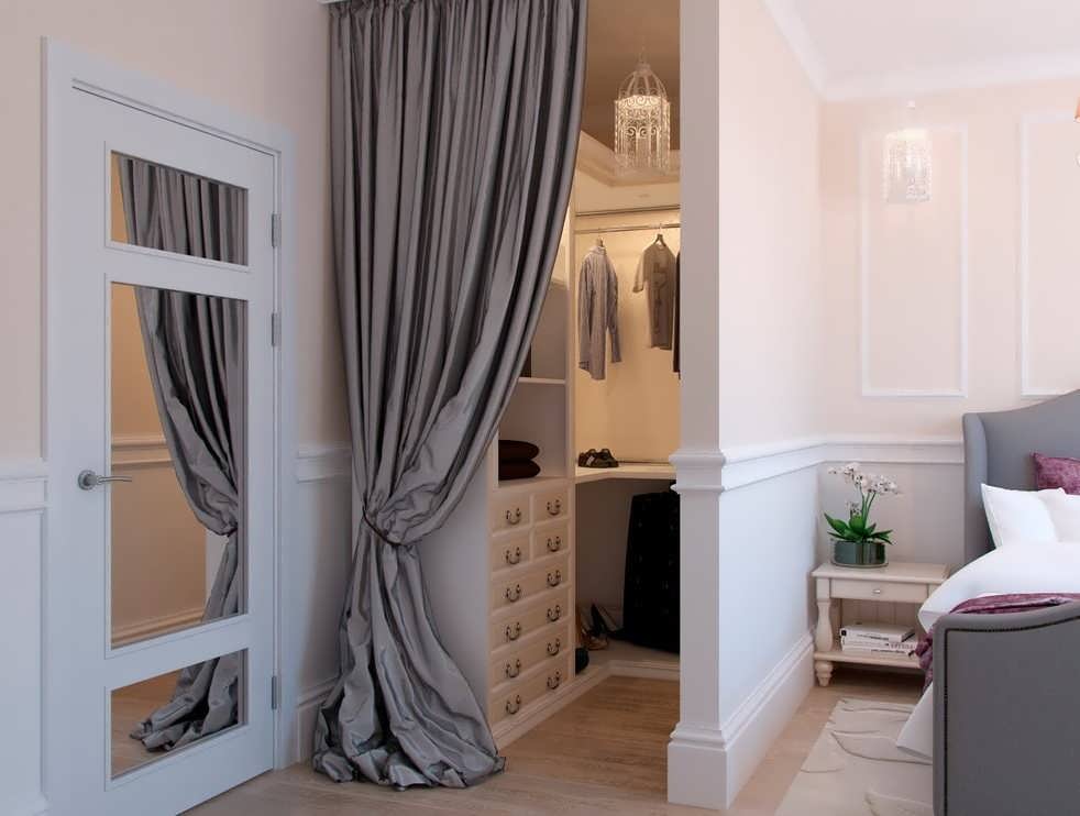 Современное оформление дверного проема гардеробного помещения выполняется плотными моделями. Портьер не должен пропускать световые лучи и позволять увидеть наполнение полок.