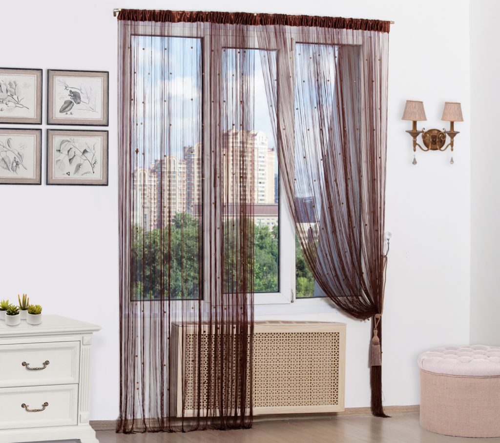 Современные нитяные занавески делают из полиэстера, они могут быть любого цвета и иногда дополняются декоративными бусинами. Такие шторы визуально расширяют помещение, не препятствуют движению воздуха, а еще красиво колышутся от ветра.