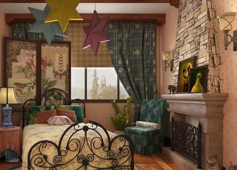 Такое помещение чем-то напоминает охотничий домик. В нем много натурального камня и грубой древесины. Текстиль более сдержанных оттенков, в клетку или полоску, иногда со звездами. Приветствуется лоскутная техника.