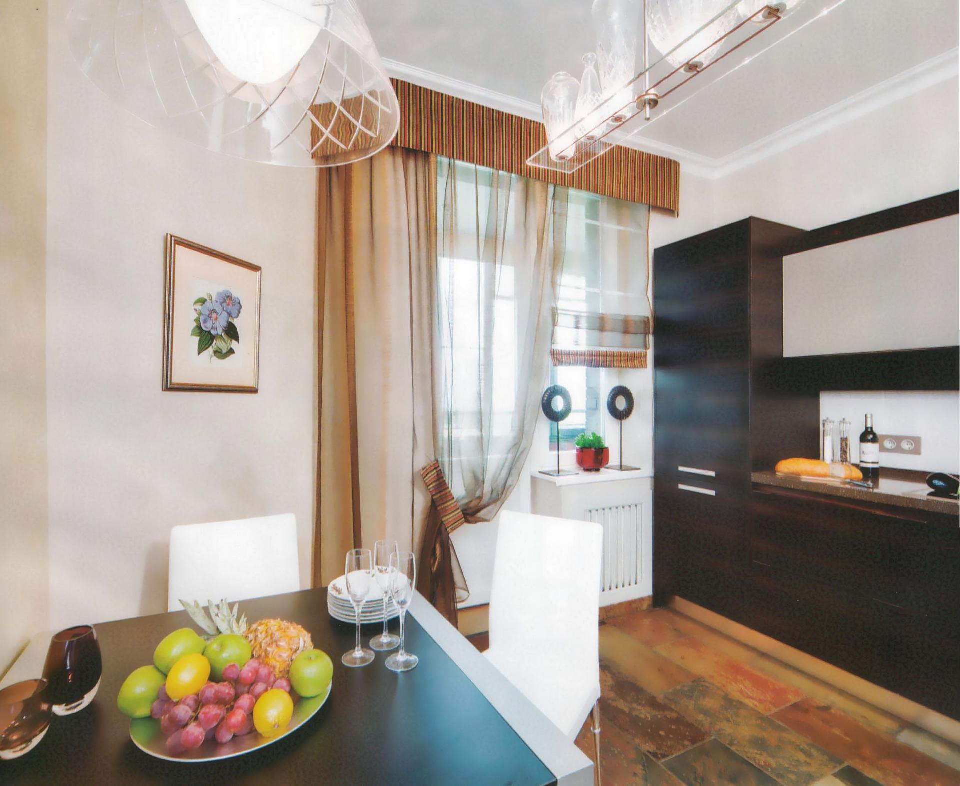 В том случае, если возле окна будут располагаться обеденные стол и стулья, то не стоит отдавать предпочтение длинным вариантам штор. Это обусловлено тем, что они будут очень быстро пачкаться.