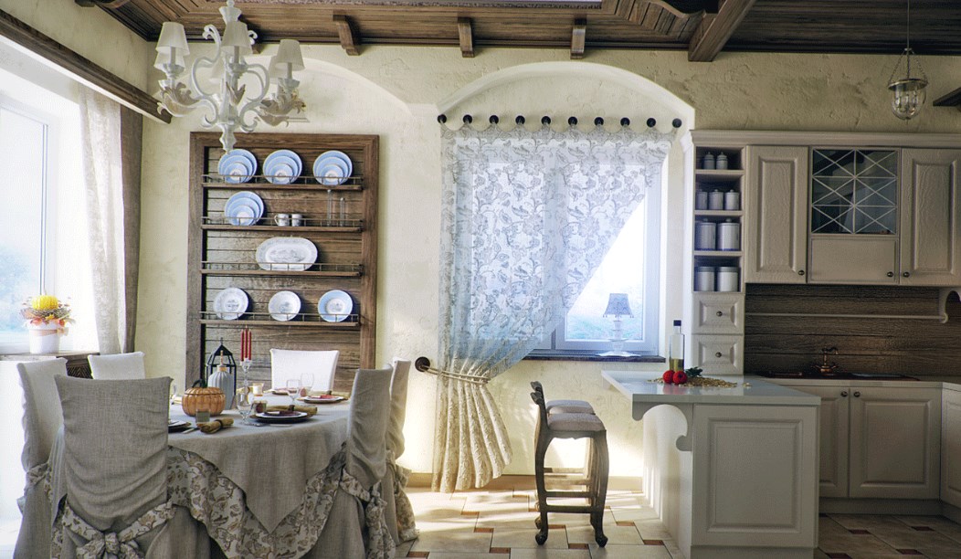 Этот стиль отражает сельский образ жизни — скромность и простоту во всех предметах, декоративные элементы из натуральных материалов, деревянные полы и потолки, занавески простого пошива по всему окну.