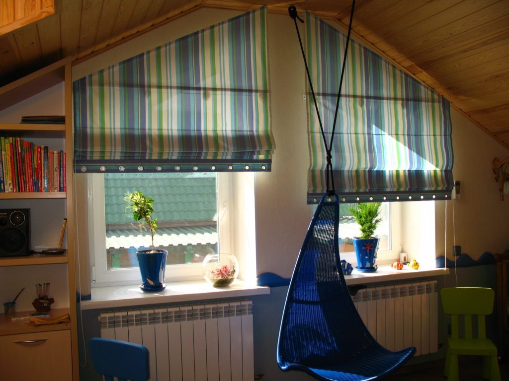 Рисунок на шторах хорошо смотрится, если мансарда оборудована детской.