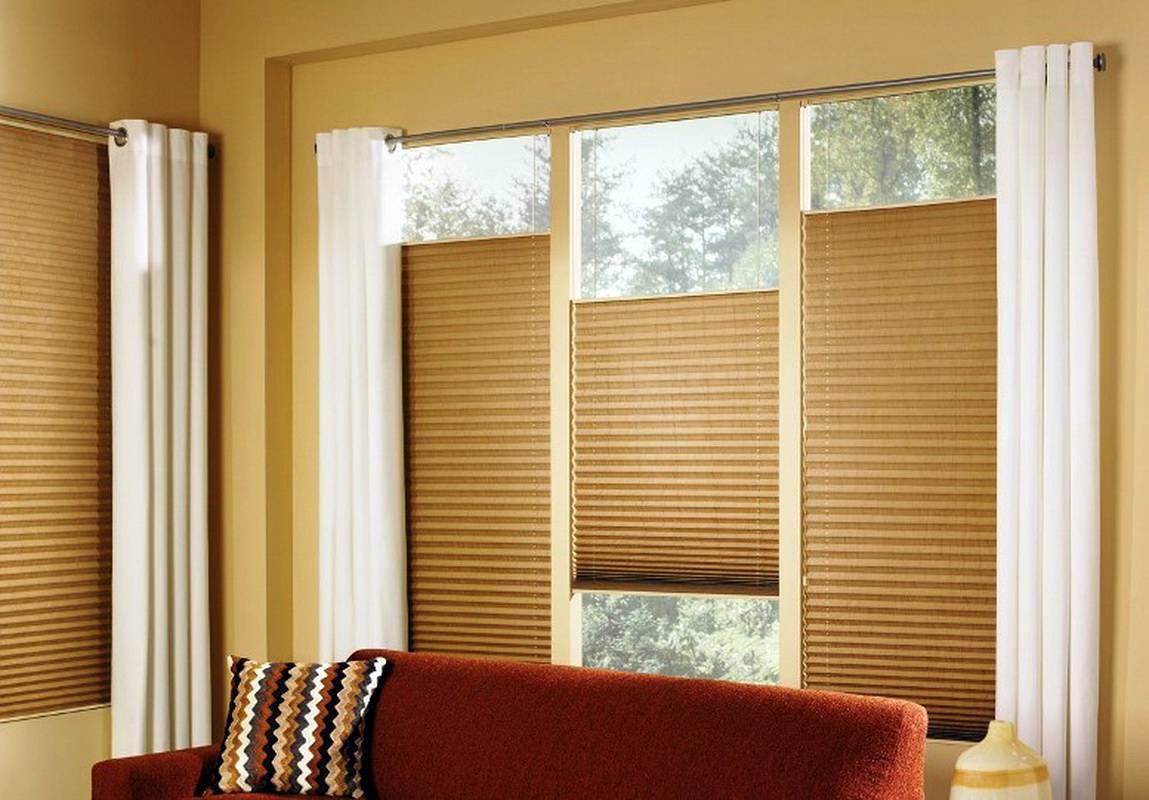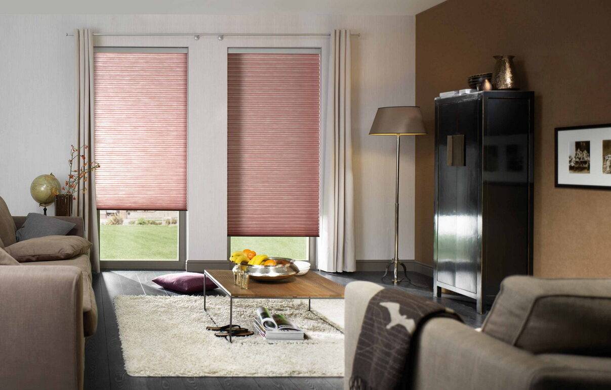 Для гостиной лучше покупать шторы плиссе, высота которых регулируется и вверху и внизу. Ими удобнее контролировать естественное дневное освещение.