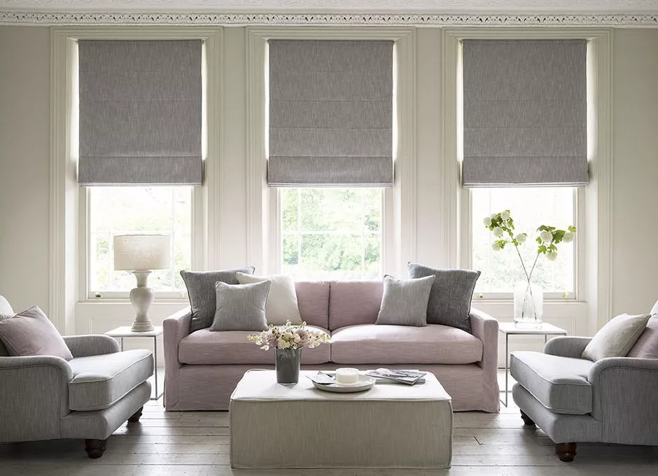 Эркерные окна можно декорировать римскими шторами и легкими занавесками