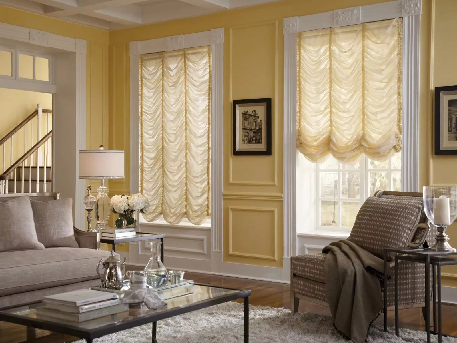 Шторы для гостиной в этом стиле должны быть небольшими, чтобы не мешать естественному освещению. Обычно такие занавески просто, уютной формы, не слишком строгие и чопорные: