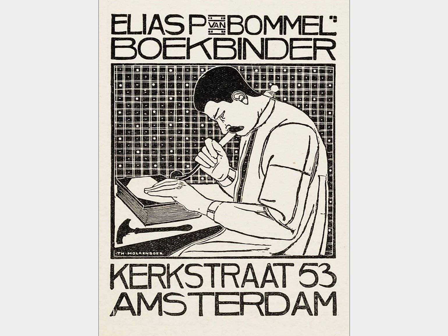 Рекламный плакат переплётчика Elias — редкий пример использования ксилографии в плакате. Разработал Тео Молкенбоер (Th. H. Molkenboer) в 1897 году. Изображение: Wikimedia Commons