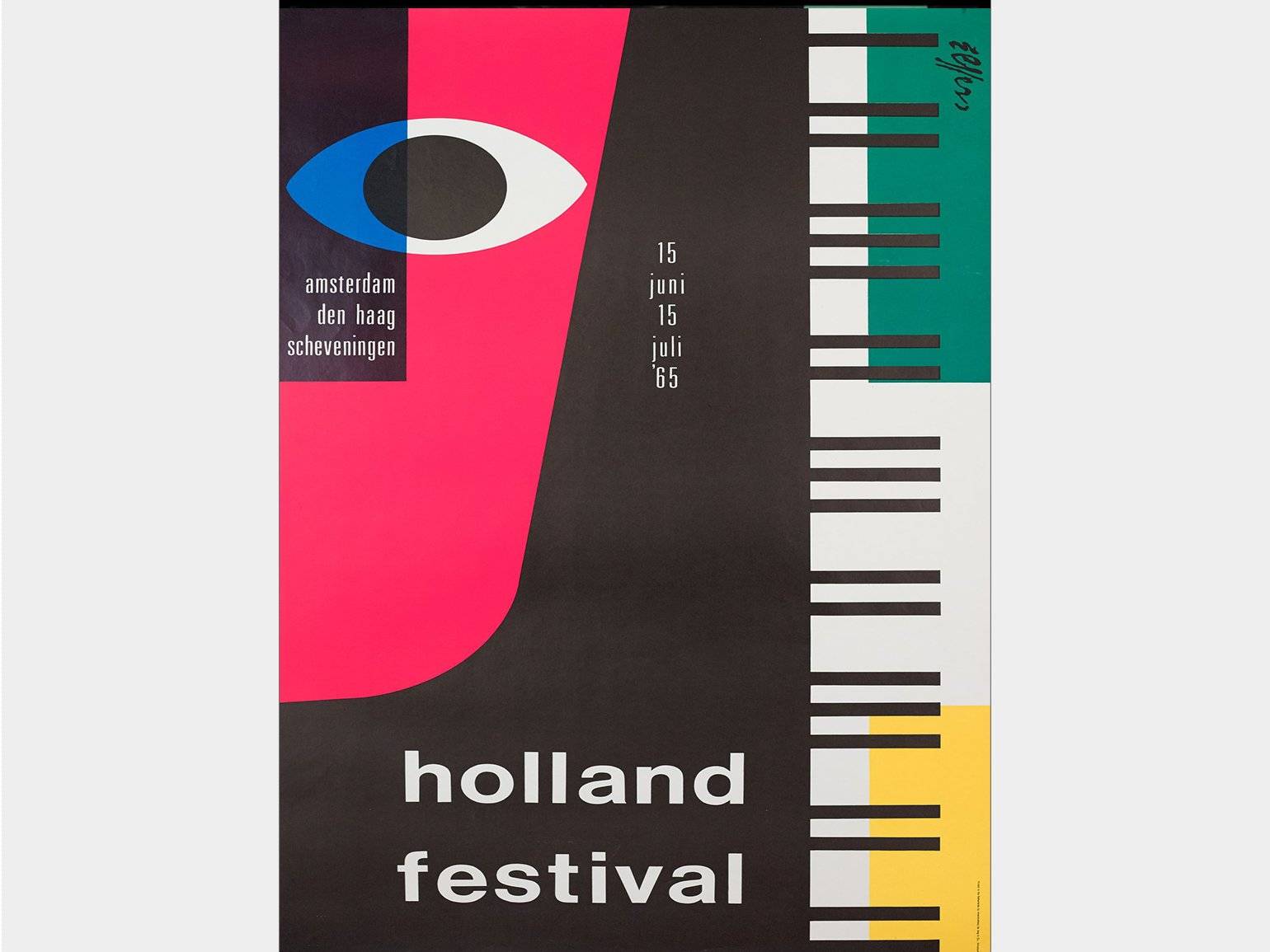 Дик Эфферс создавал плакаты для фестиваля исполнительных искусств Нидерландов. На этом плакате он сочетает музыку в виде клавишных и изобразительное искусство с прямым взглядом на абстрактном лице. Плакат для Holland Festival, 1965 г. Изображение: Dick Elffers / Stedelijk Museum Amsterdam