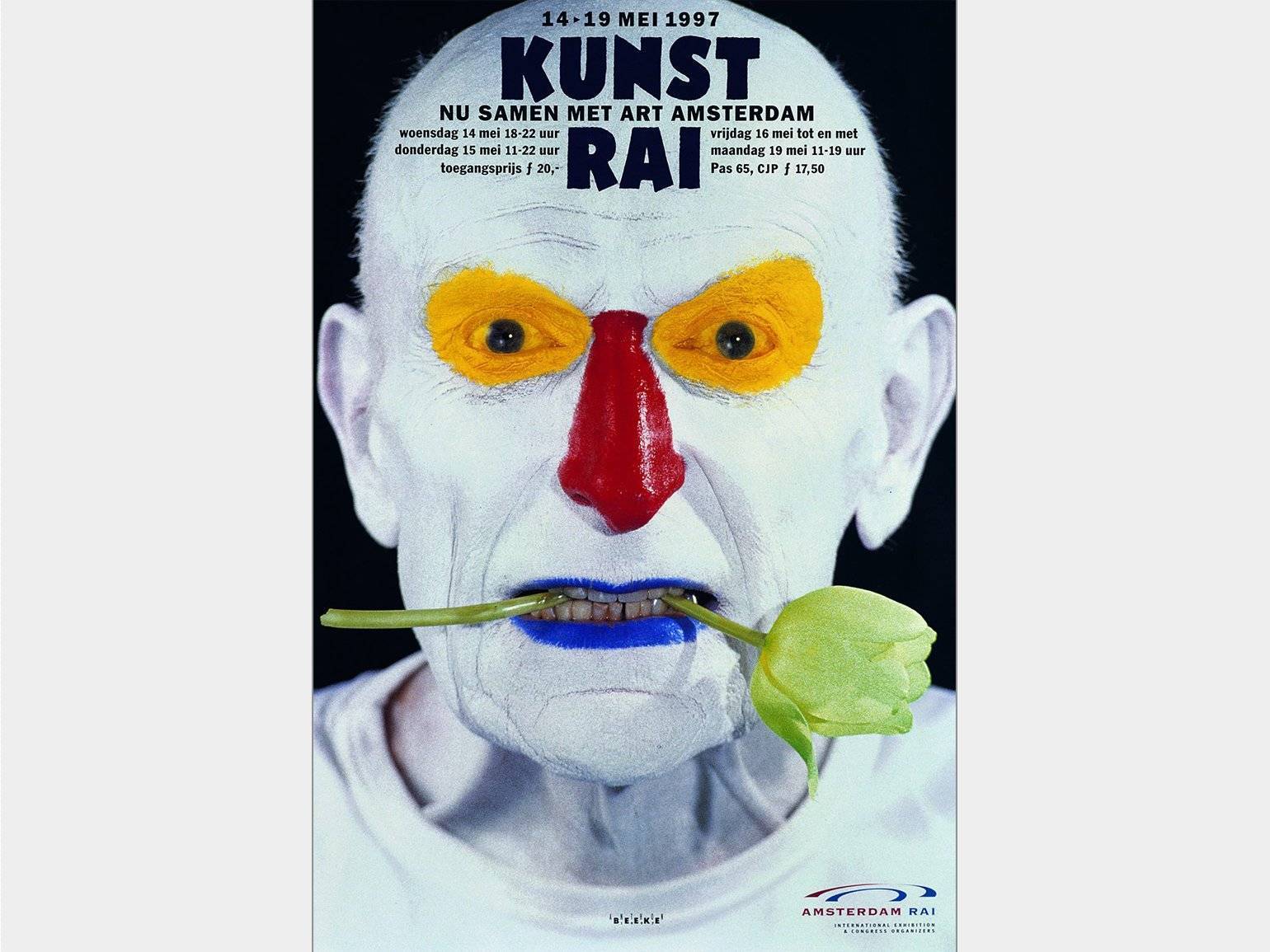 Плакат KunstRAI. На плакате дизайнер Бенно Премсел в роли злого клоуна. На него сильно влиял Баухауз, поэтому основными цветами Бейке выбрал красный, жёлтый и синий. Зёленый тюльпан — отсылка к конфликту между Питом Мондрианом и Тео ван Дусбургом по поводу основных цветов. Антон Бейке, 1997 г. Изображение: Anthon Beeke
