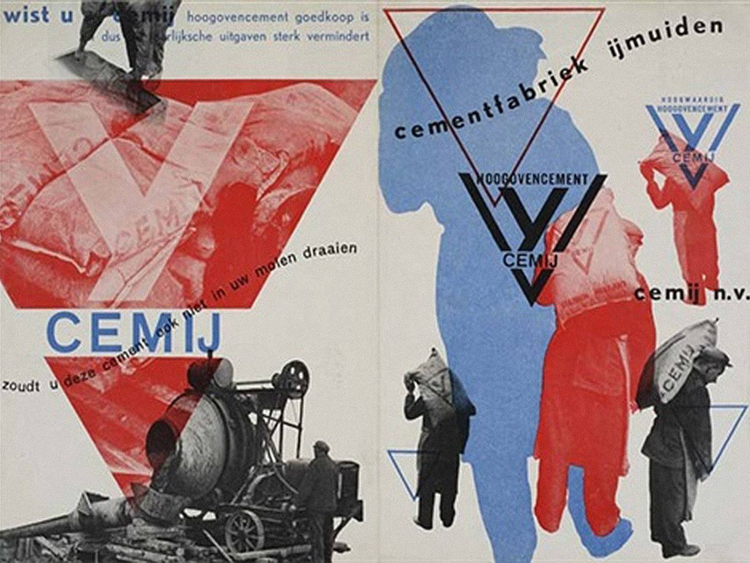 Плакат для цементной компании Ijmuiden. Пауль Шуйтема придерживался простоты, асимметрии и контраста, сочетал вертикальные, горизонтальные и диагональные линии. В его плакатах изображения — не просто декорации. Типографика, шрифтовые начертания и формы складываются в органичную композицию. Это сложилось в узнаваемый стиль дизайнера. Изображение: Paul Schuitema/ Nederlands Fotomuseum / Stedelijk Museum Amsterdam