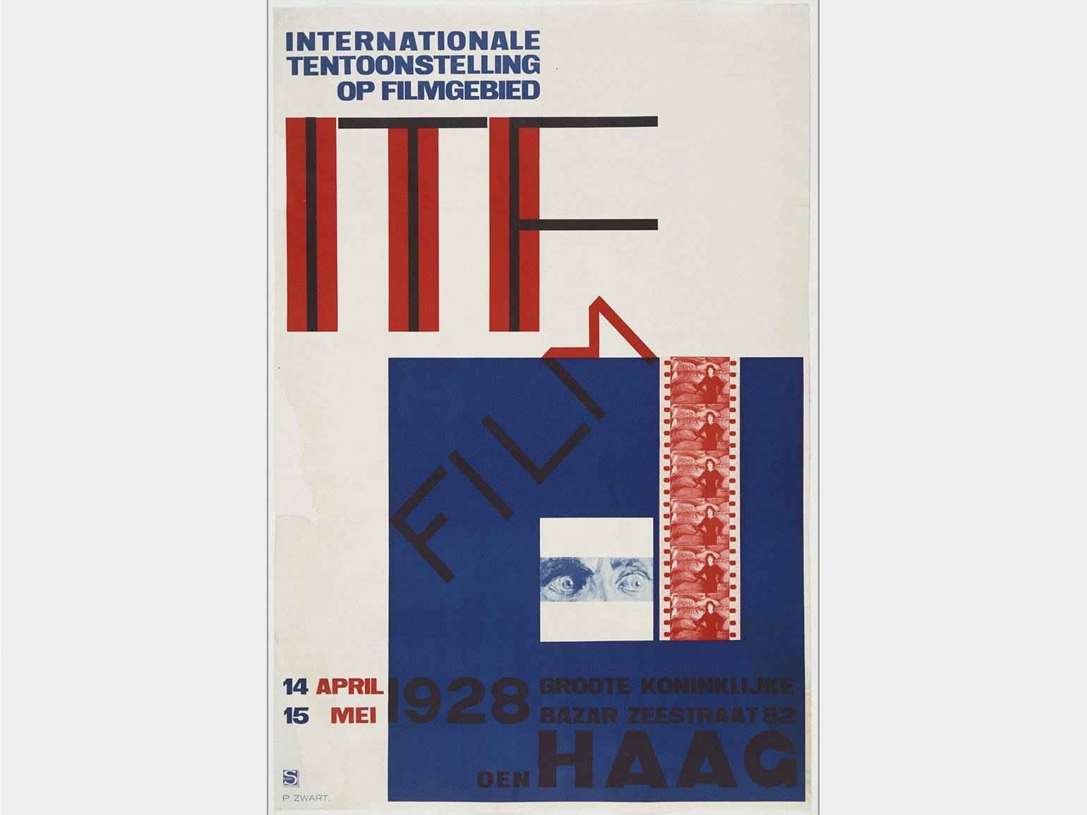 Прямые линии, геометричные надписи и основные цвета плаката показывают влияние движения «Де Стейл» на работы Пита Цварта. Афиша кинофестиваля в Гааге, 1928 г. Изображение: 2018 Artists Rights Society (ARS), New York / c/o Pictoright Amsterdam