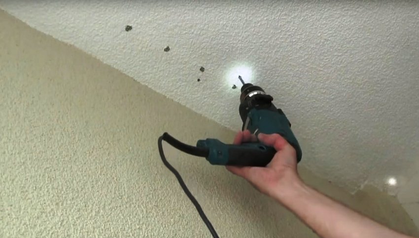| Проделайте перфоратором отверстия в потолке и вставьте в них дюбели |