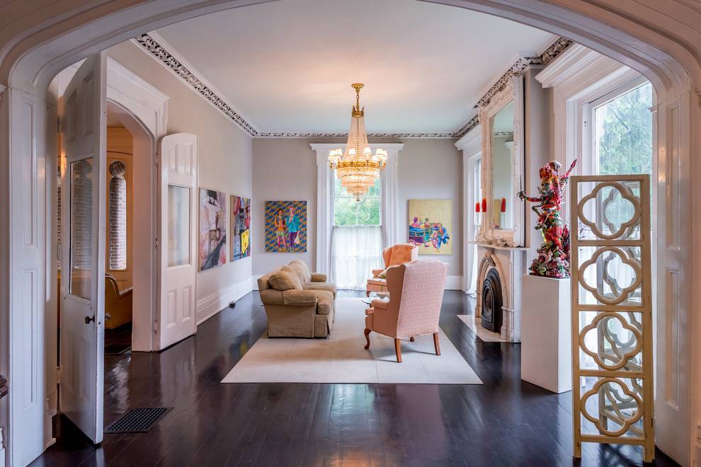 - Крупные картины, которые должны размещаться на уровне двух этажей, либо же двухъярусные панно, отвечающие общей тематике гостиной;