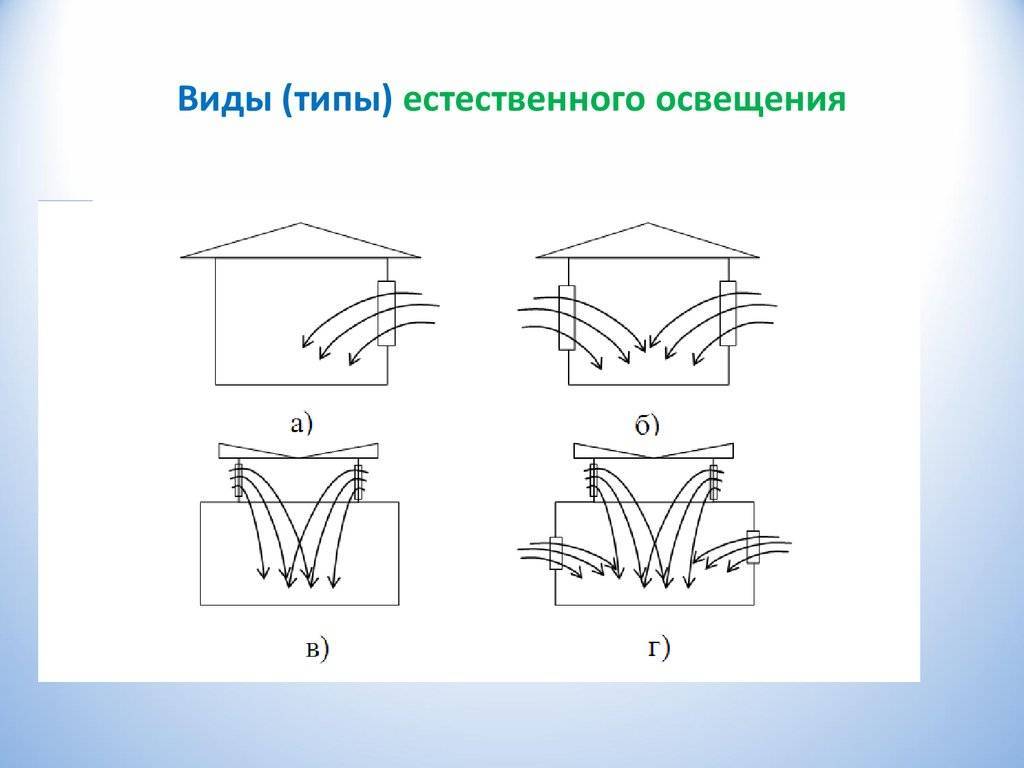 Условно эти приёмы можно разделить на три вида естественного освещения: боковое (а,б), верхнее (в) и комбинированное (г).