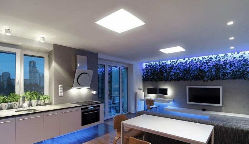 Если комната оформлена в стиле минимализма или «хай-тек», то можно воспользоваться современными софитами или светодиодными панелями, монтаж которых возможен для подвесных и натяжных потолков.