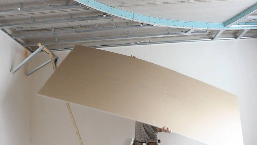 - Прикрепить лист ГКЛ к потолку.
