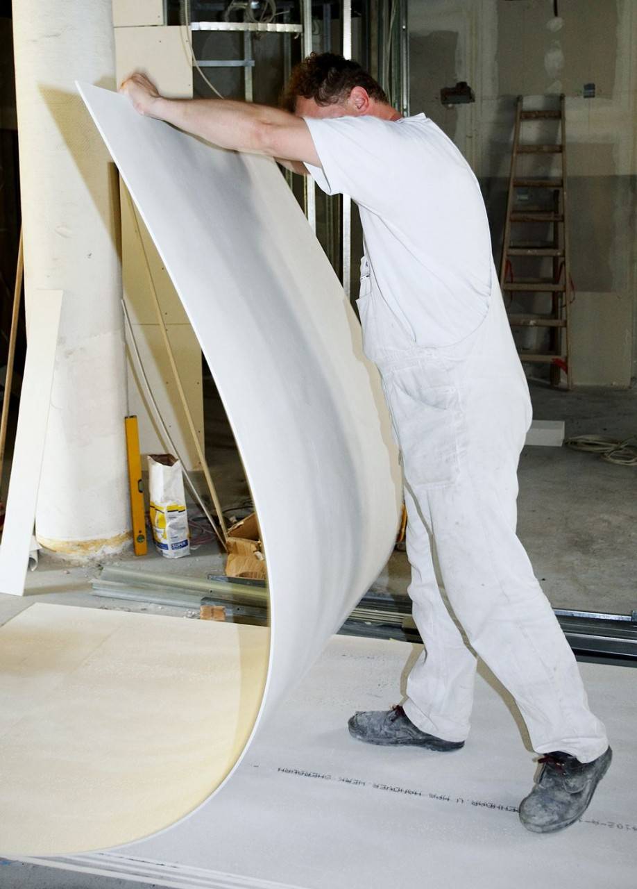 При помощи фрезерования гипсокартона , создаются изогнутые поверхности не слишком крутого радиуса. погружают в материал на 3 мм. Инструмент прорезает гипсовый слой почти полностью, при этом, не затрагивая картон с противоположной от разреза стороны. Благодаря этому процессу, конструкция может принимать любую форму.