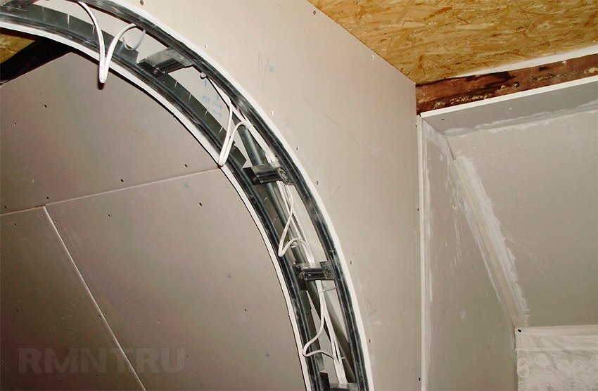 После того как закреплены обе стенки, к ним изнутри через гипсокартон прикручивают две полосы арочного профиля для крепления свода. Если арочного профиля нет, то его делают из CD профиля, симметрично вырезая по бокам клинья на расстоянии 4–5 см друг от друга.