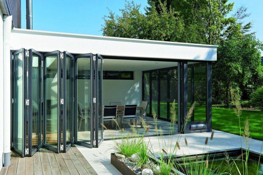 - Если сделать остекленную просторную пристройку, наподобие веранды, можно получить дополнительную комнату для отдыха с видом на сад. В большинстве случаев такие постройки превращаются в полноценные веранды с панорамным остекленением.
