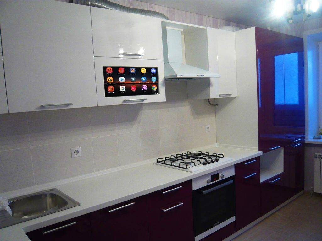встроенный телевизор – на этапе покупки (или заказа) кухонного гарнитура предусмотреть нишу (шкафчик), куда вставить телевизор