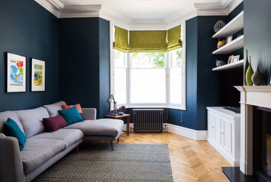 - Синий. Насыщенный тон, вызывающий ассоциации элегантности, заряжает энергией, дополнительной бодростью. Для смягчения (одомашнивания) интерьера разбавляется менее насыщенными тонами. Отлично сочетаются с белым цветом.