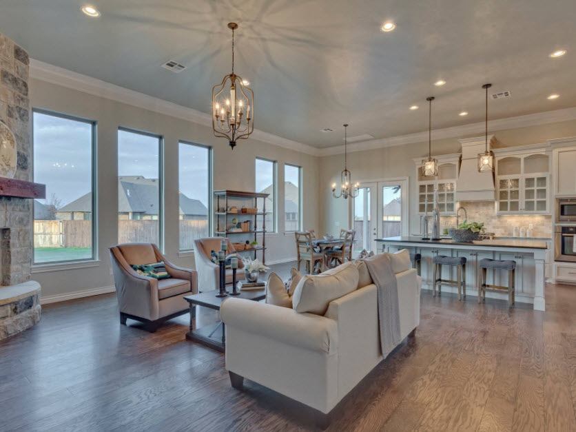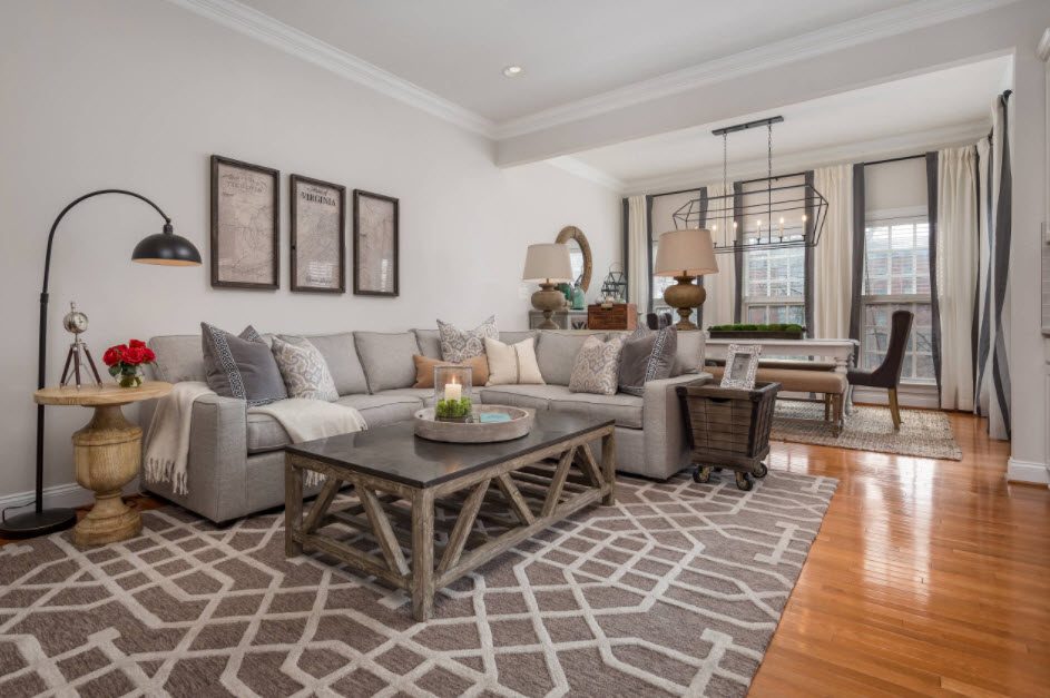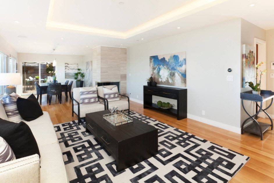 Например, в гостиной с темным полом можно для отделки стен использовать материалы в средних тонах, дополнить интерьер светлыми аксессуарами. Если настенная отделка темная, на ее фоне будет выгодно смотреться мебель в светлых оттенках.