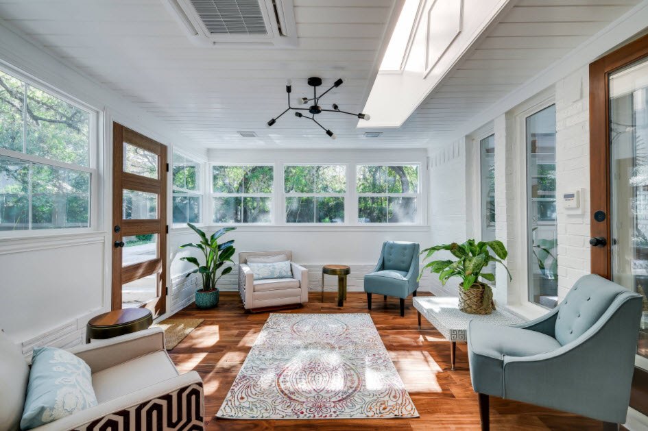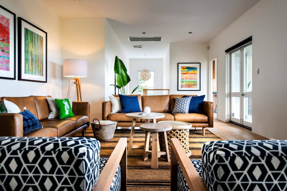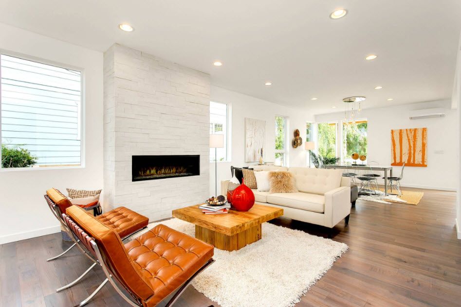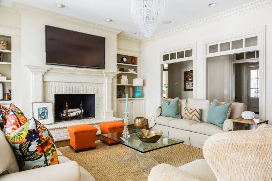 Одним из главных условий использования белого в интерьере является его обязательное разбавление другими цветами. Однотонная белая гостиная больше будет напоминать больничную палату или комнату, находящуюся в фазе ремонта. Чтобы этого избежать, необходимо добавить в обстановку цветную мебель, аксессуары, рисунки на поверхностях и даже оттеночное освещение. Белая база – это прекрасный способ дать волю фантазии и нанести на нее все свои пожелания.