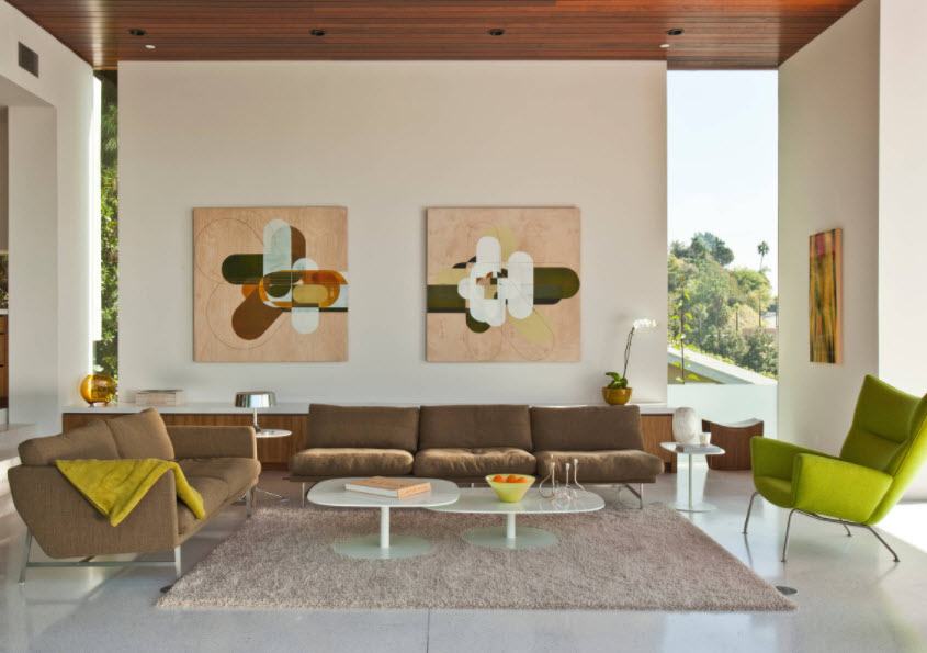 Столь же мягким выглядит интерьер в коричневых тонах. Кроме натуральности, такой цвет придает гостиной шик и роскошную атмосферу. Приятные шоколадные стены могут украсить комнату с хорошим освещением и достаточной площадью. Если желание использовать темные оттенки велико, то рекомендуется сначала выкрасить стены, а потом подбирать остальные объекты обстановки. На каждом этапе нужно анализировать свои ощущения от пребывания в гостиной. Если это место не кажется темным, то можно считать, что детали подобраны верно.